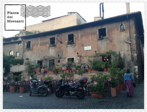 Acabamos de instalarnos en el Trastévere. Llegar hasta el apartamento en coche nos ha permitido tener un primer contacto con el barrio bastante impactante. Adentrase en él por sus estrechos callejones no ha sido una tarea fácil, sobre todo después del estrés que produce el agitado tráfico de Roma, esquivando a las veloces y temerarias motocicletas que a todas horas circulan por la ciudad. Las calles parecen sacadas de un cuento, estamos en la Piazza dei Mercanti, flanqueada por dos restaurantes cuyas fachadas nos han dejado boquiabiertos.